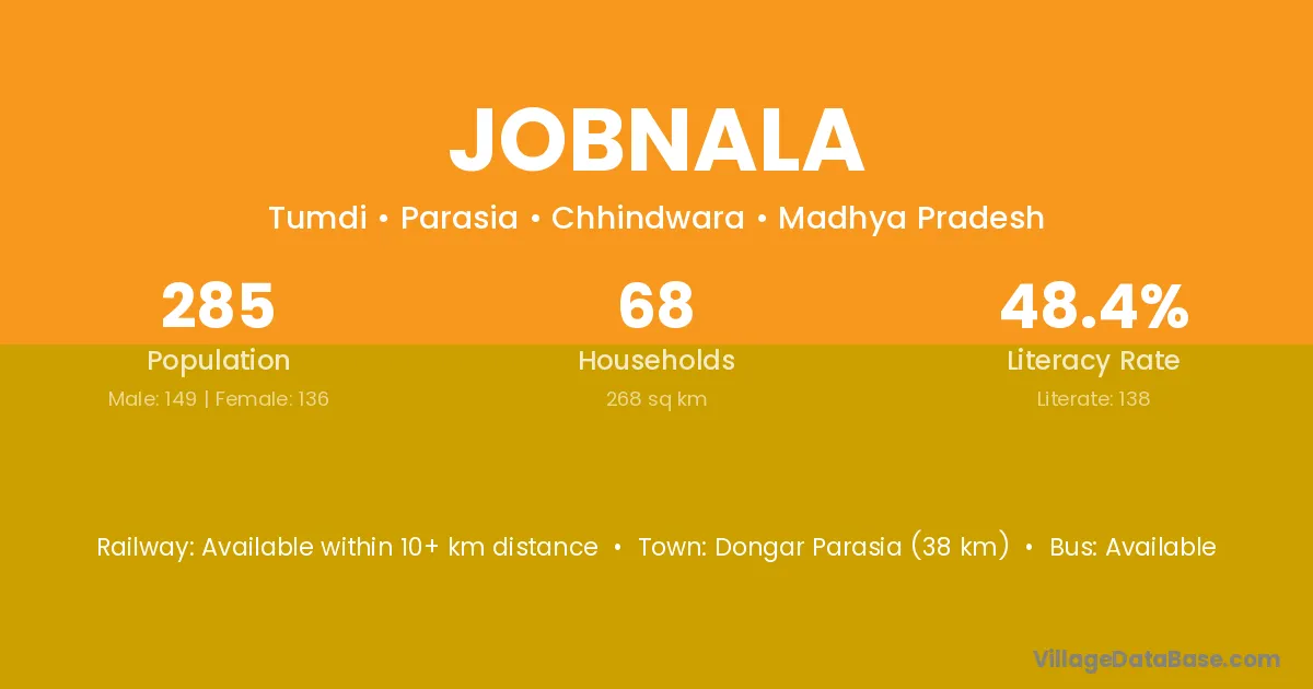 Jobnala village has a total population of 285 people, of which 149 are males and 136 are females.