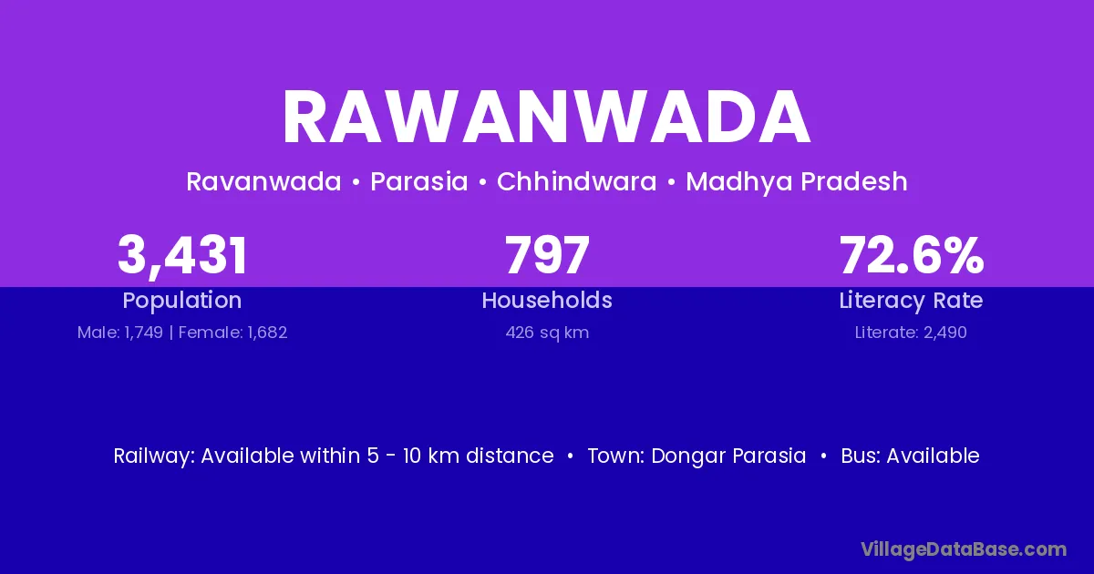 Rawanwada village has a total population of 3,431 people, of which 1,749 are males and 1,682 are females.