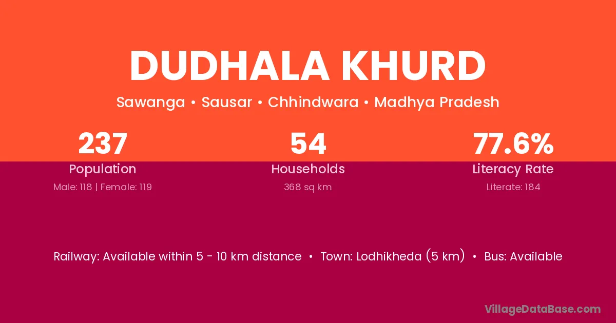 Lodhikheda (5 km) is the nearest town to Dudhala Khurd village for major economic activities and is located approximately 5 km away.