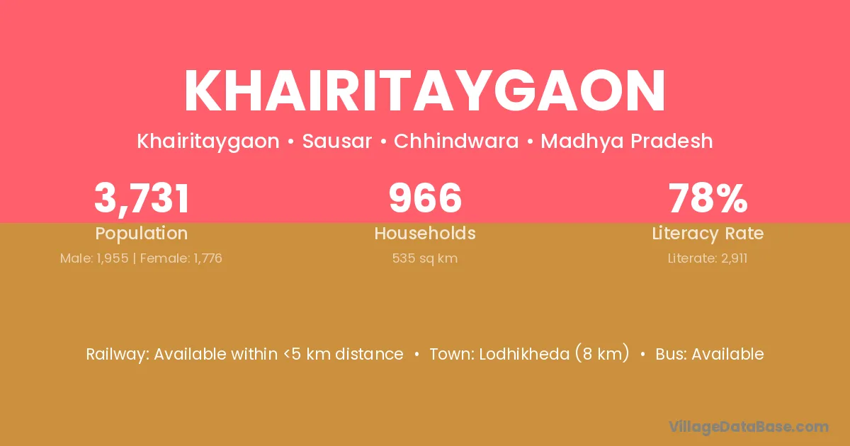 Lodhikheda (8 km) is the nearest town to Khairitaygaon village for major economic activities and is located approximately 8 km away.