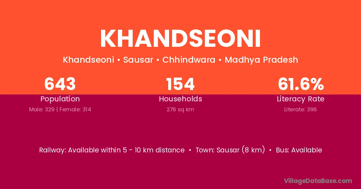 Khandseoni village has a total population of 643 people, of which 329 are males and 314 are females.