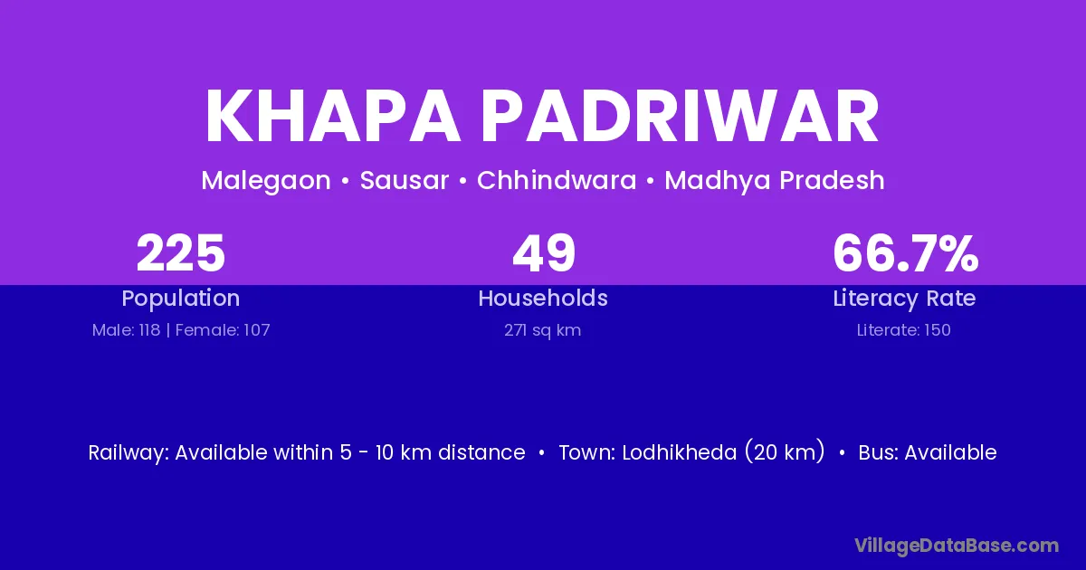 Lodhikheda (20 km) is the nearest town to Khapa Padriwar village for major economic activities and is located approximately 20 km away.