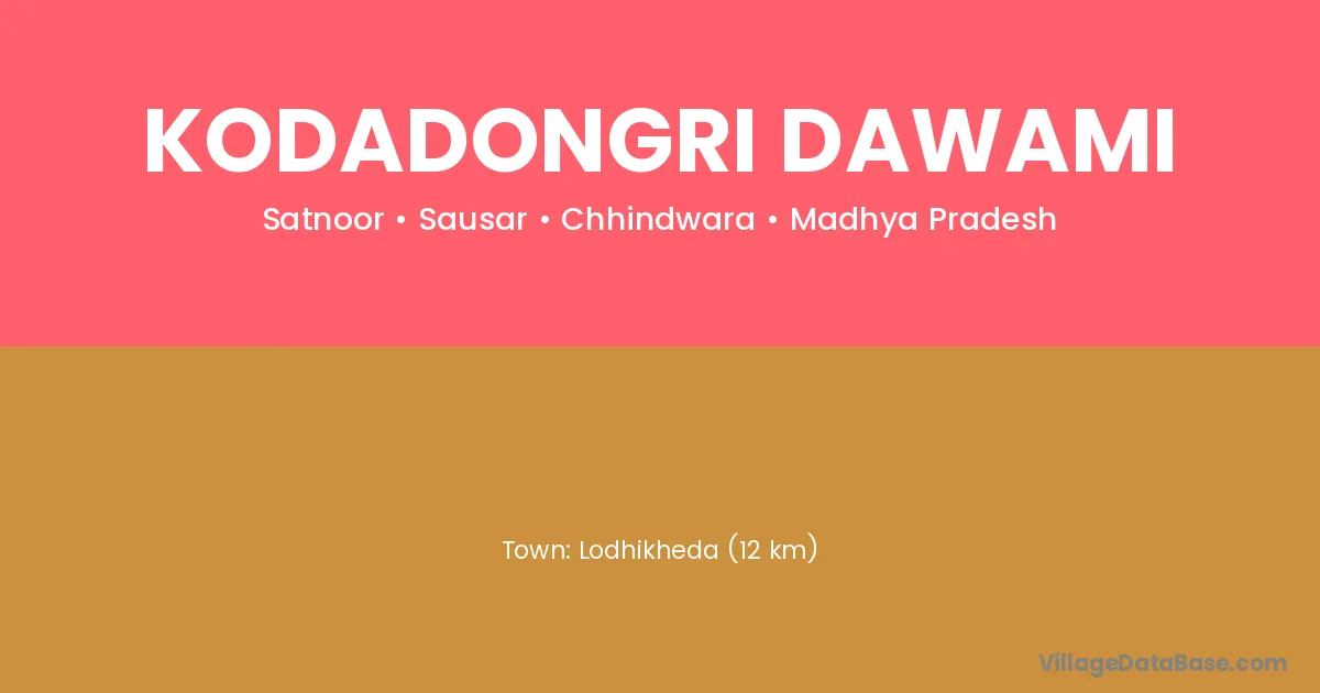 Lodhikheda (12 km) is the nearest town to Kodadongri Dawami village for major economic activities and is located approximately 12 km away.