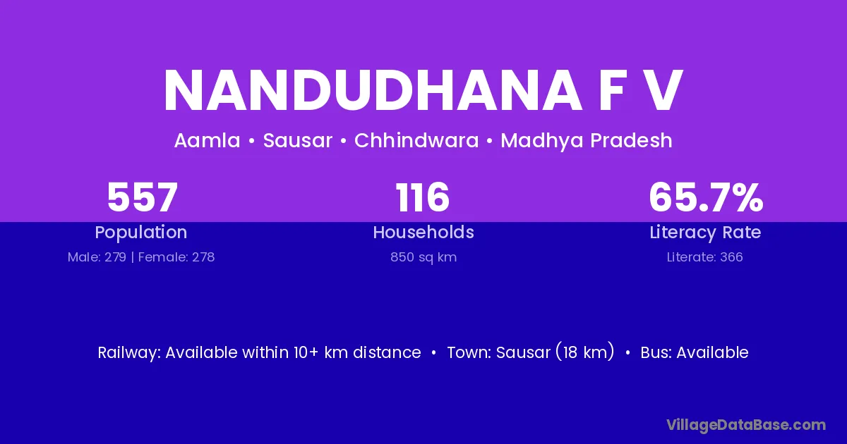 Sausar (18 km) is the nearest town to Nandudhana F V village for major economic activities and is located approximately 18 km away.