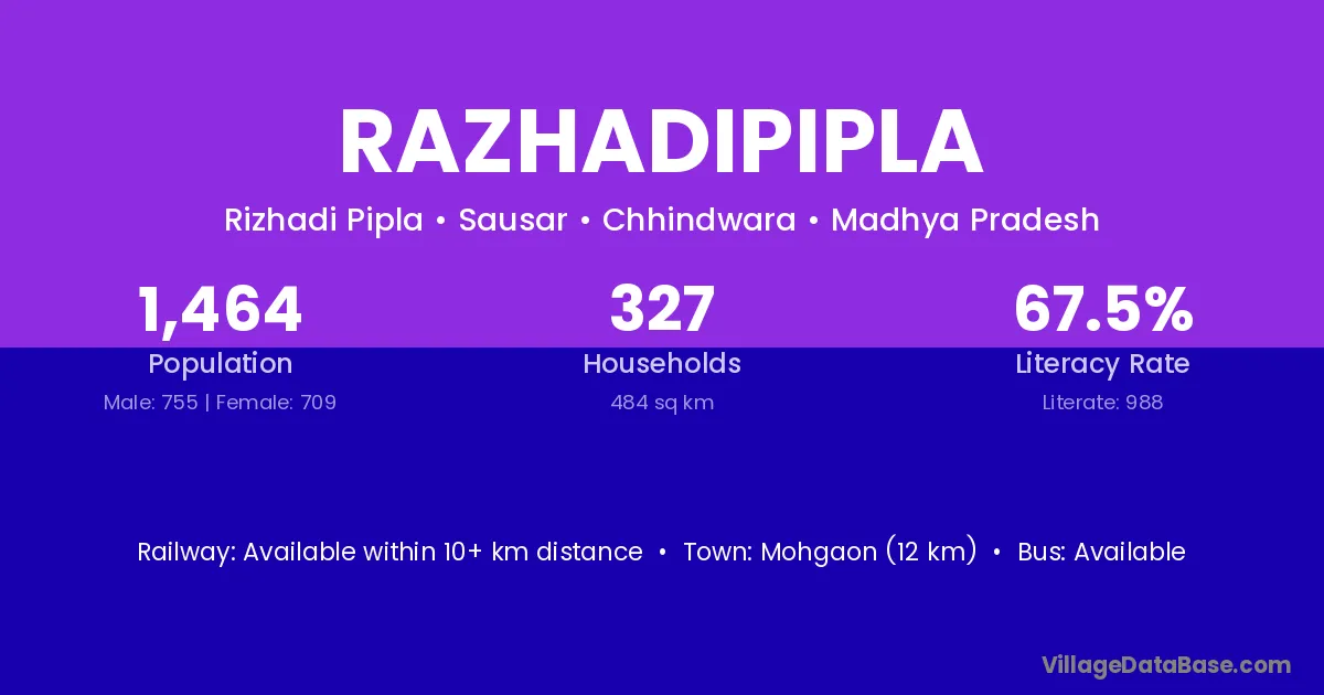 Mohgaon (12 km) is the nearest town to Razhadipipla village for major economic activities and is located approximately 12 km away.