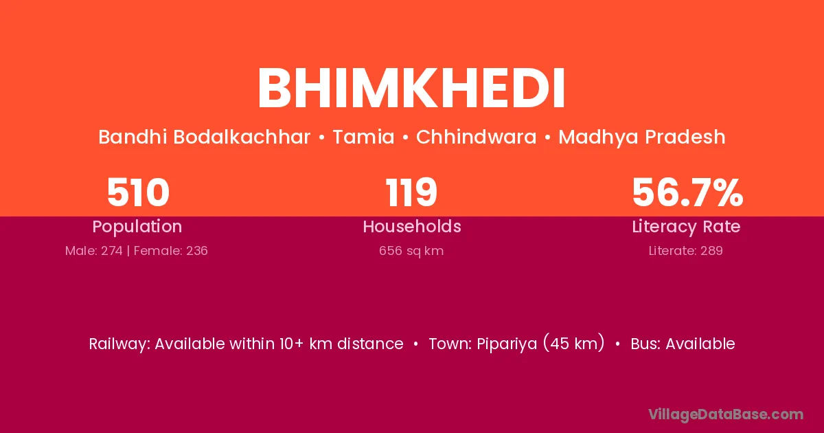 Pipariya (45 km) is the nearest town to Bhimkhedi village for major economic activities and is located approximately 45 km away.