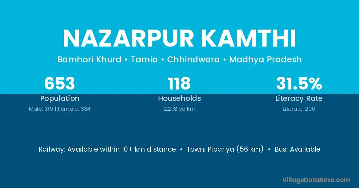 Pipariya (56 km) is the nearest town to Nazarpur Kamthi village for major economic activities and is located approximately 56 km away.