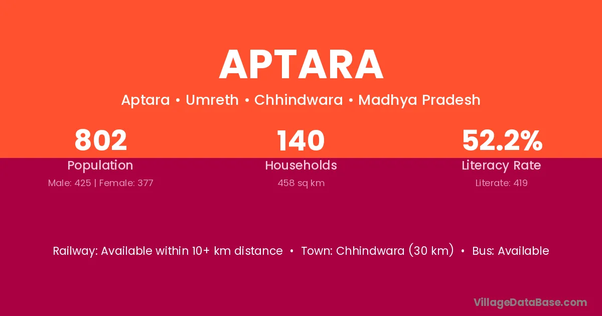 Chhindwara (30 km) is the nearest town to Aptara village for major economic activities and is located approximately 30 km away.