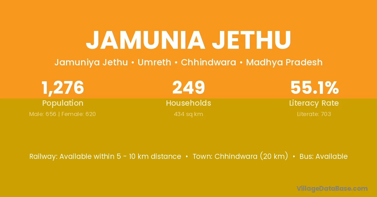 Chhindwara (20 km) is the nearest town to Jamunia Jethu village for major economic activities and is located approximately 20 km away.
