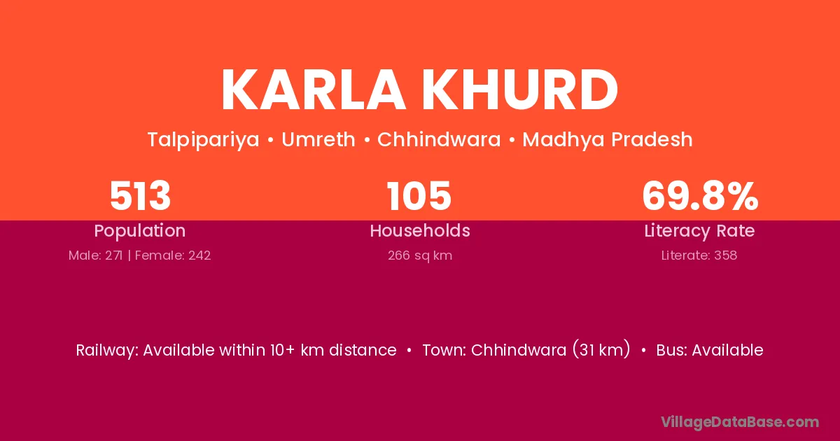 Chhindwara (31 km) is the nearest town to Karla Khurd village for major economic activities and is located approximately 31 km away.