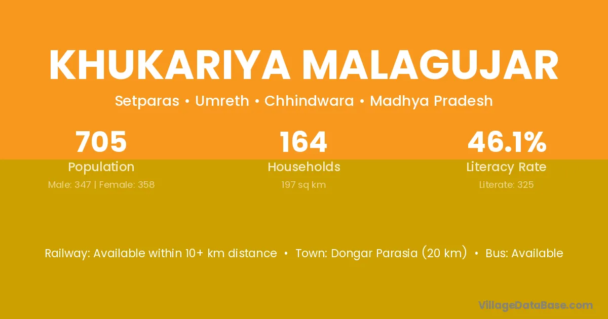 Dongar Parasia (20 km) is the nearest town to Khukariya Malagujar village for major economic activities and is located approximately 20 km away.