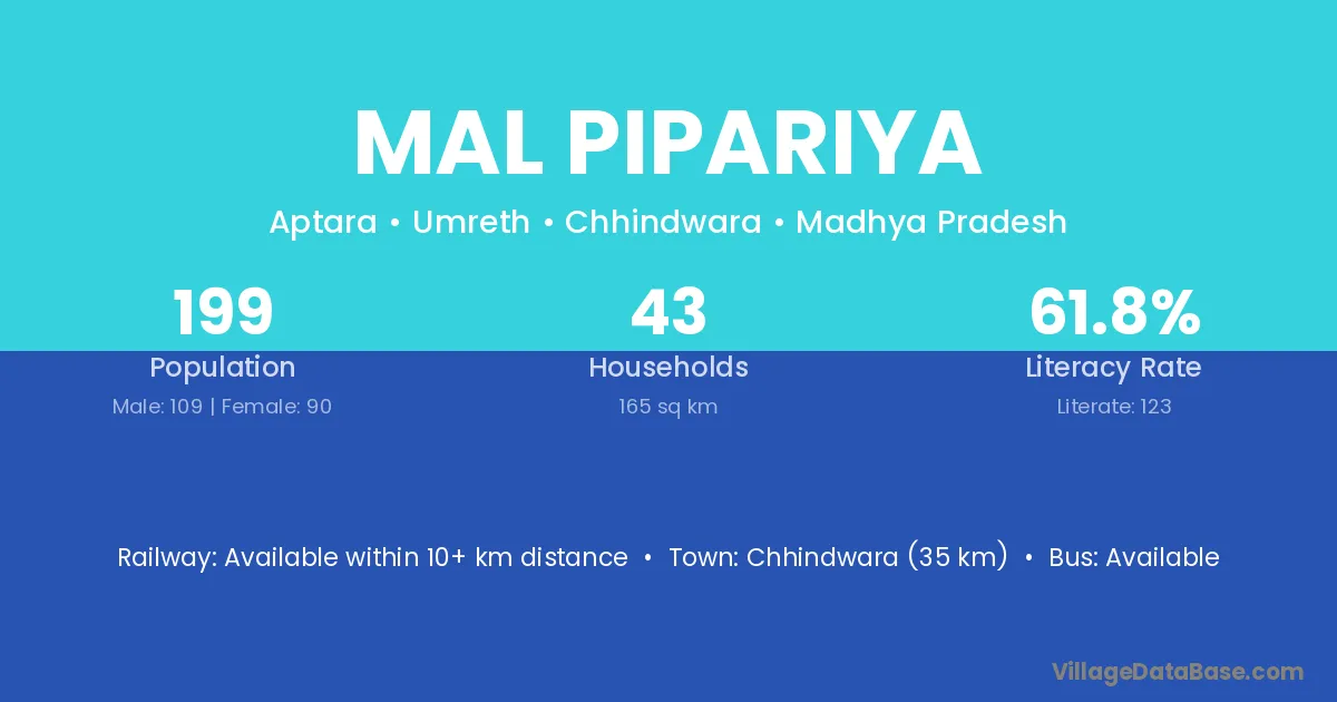 Chhindwara (35 km) is the nearest town to Mal Pipariya village for major economic activities and is located approximately 35 km away.