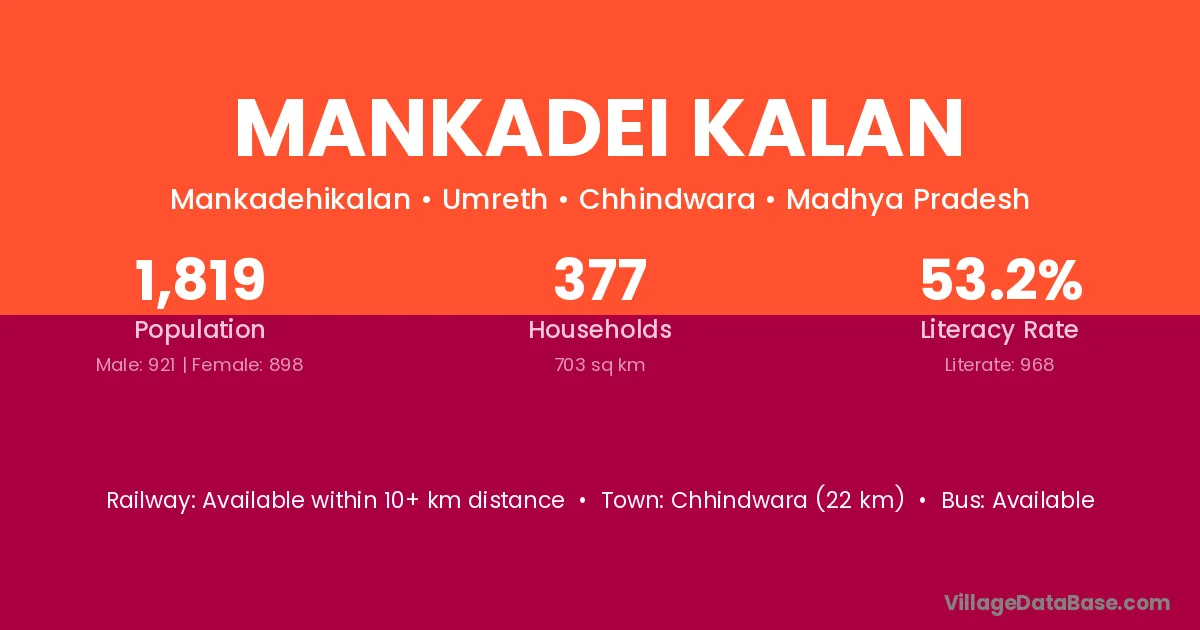 Chhindwara (22 km) is the nearest town to Mankadei Kalan village for major economic activities and is located approximately 22 km away.