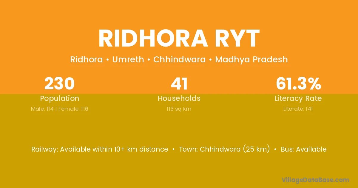 Chhindwara (25 km) is the nearest town to Ridhora Ryt village for major economic activities and is located approximately 25 km away.
