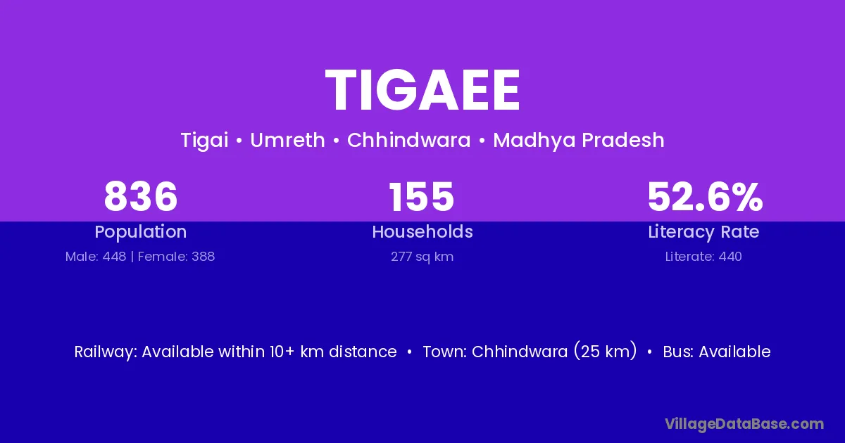 Chhindwara (25 km) is the nearest town to Tigaee village for major economic activities and is located approximately 25 km away.