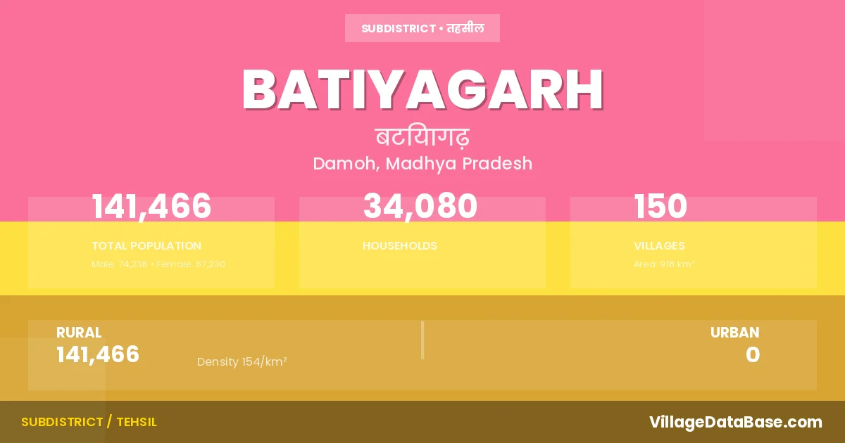 According to the 2011 census The total area of Batiyagarh Tehsil is 918 km², with a population of 141466 people. The population density is 154 inhabitants per square kilometre, and there are approximately 34080 houses in the sub district.