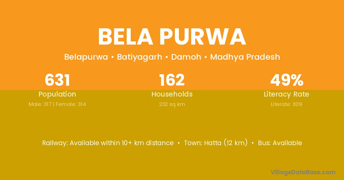 Hatta (12 km) is the nearest town to Bela Purwa village for major economic activities and is located approximately 12 km away.