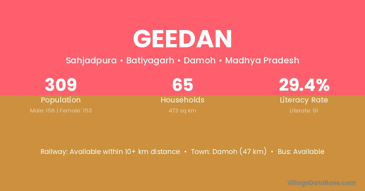 Damoh (47 km) is the nearest town to Geedan village for major economic activities and is located approximately 47 km away.