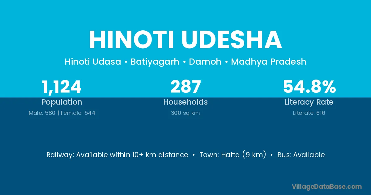 Hatta (9 km) is the nearest town to Hinoti Udesha village for major economic activities and is located approximately 9 km away.