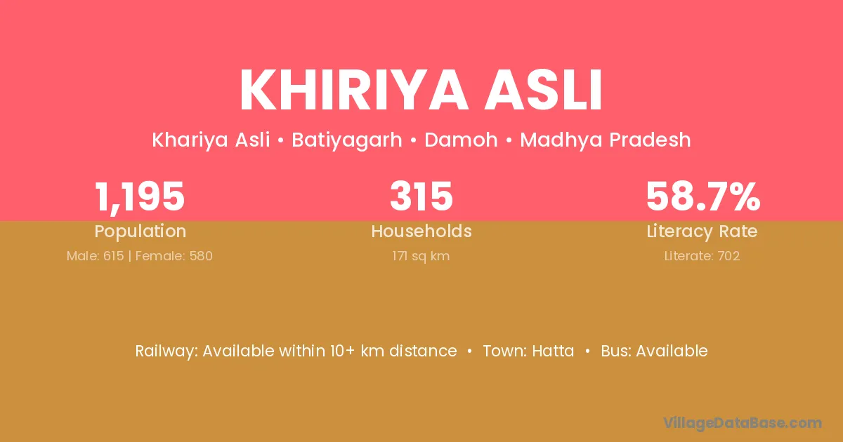Khiriya Asli village has a total population of 1,195 people, of which 615 are males and 580 are females.