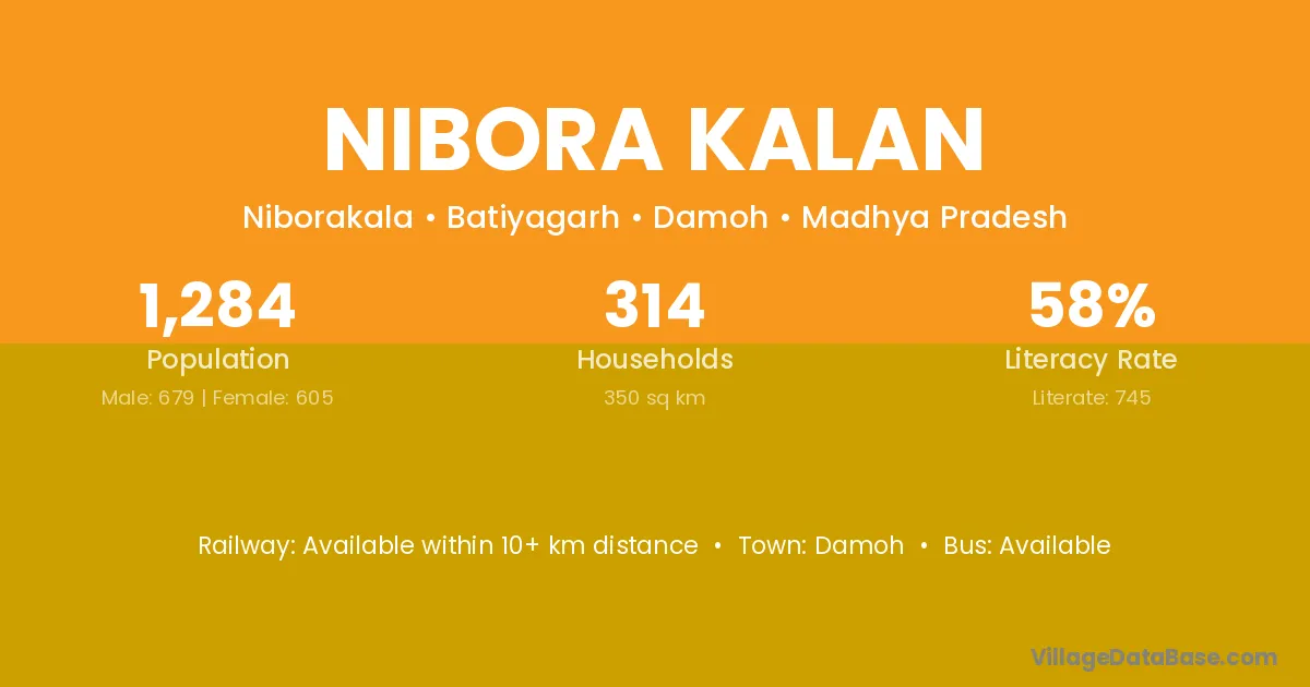 Damoh is the nearest town to Nibora Kalan village for major economic activities