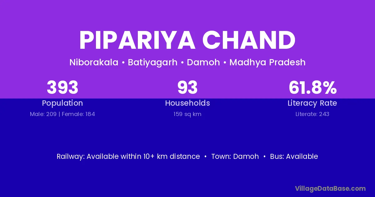 Pipariya Chand village has a total population of 393 people, of which 209 are males and 184 are females.