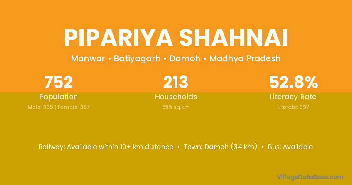 Damoh (34 km) is the nearest town to Pipariya Shahnai village for major economic activities and is located approximately 34 km away.