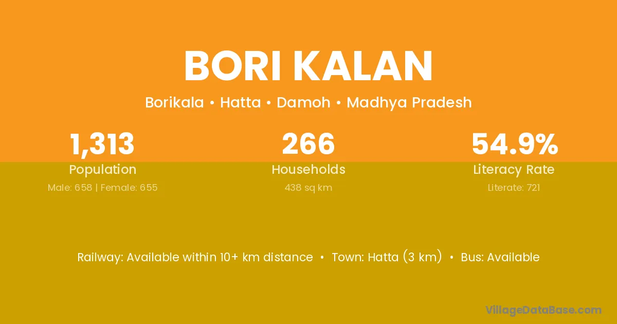 Bori Kalan village has a total population of 1,313 people, of which 658 are males and 655 are females.