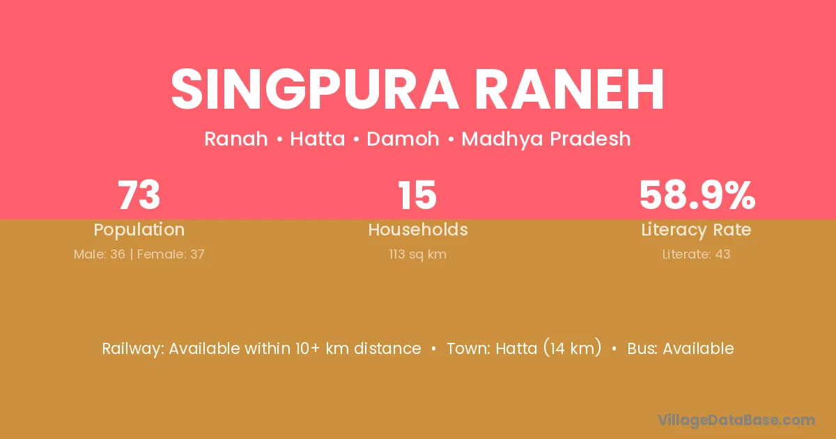 Singpura Raneh village has a total population of 73 people, of which 36 are males and 37 are females.