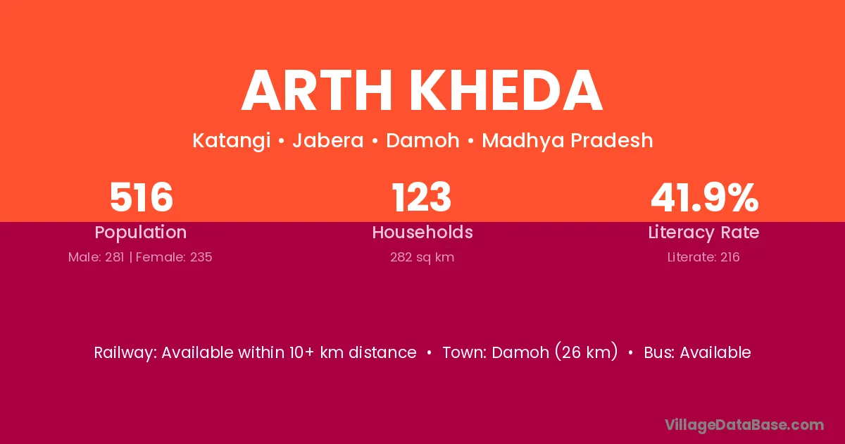 Damoh (26 km) is the nearest town to Arth Kheda village for major economic activities and is located approximately 26 km away.
