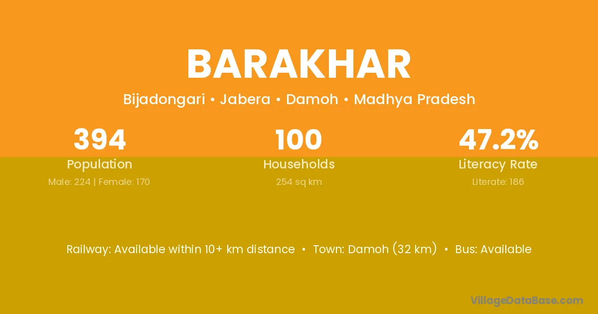 Damoh (32 km) is the nearest town to Barakhar village for major economic activities and is located approximately 32 km away.