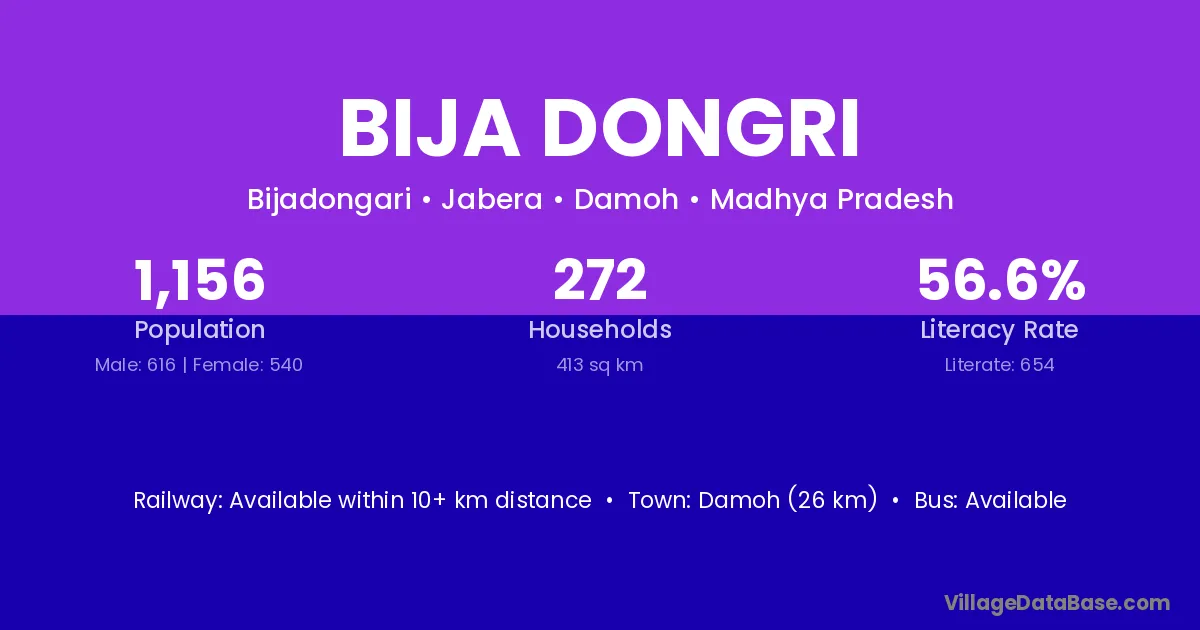 Damoh (26 km) is the nearest town to Bija Dongri village for major economic activities and is located approximately 26 km away.