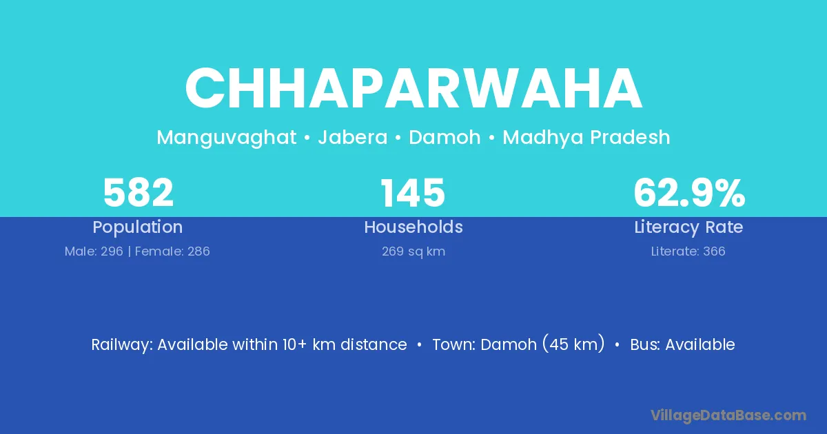 Damoh (45 km) is the nearest town to Chhaparwaha village for major economic activities and is located approximately 45 km away.
