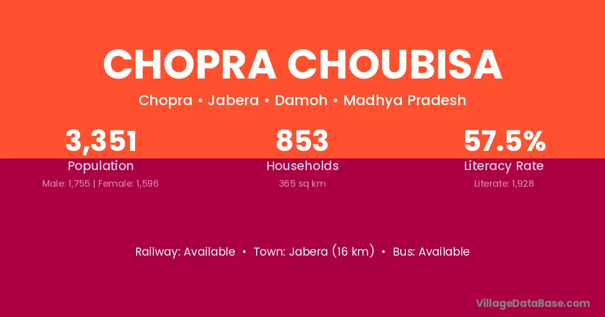 Jabera (16 km) is the nearest town to Chopra Choubisa village for major economic activities and is located approximately 16 km away.