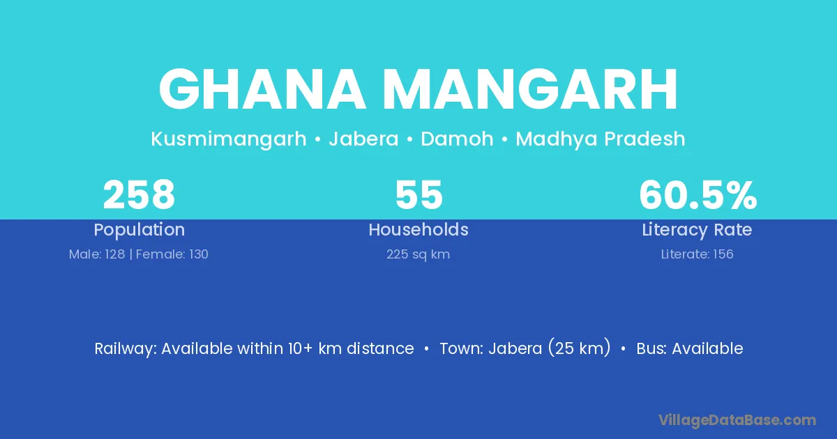 Jabera (25 km) is the nearest town to Ghana Mangarh village for major economic activities and is located approximately 25 km away.