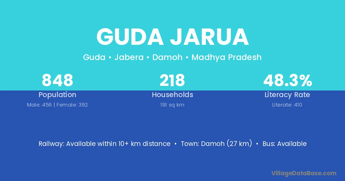 Damoh (27 km) is the nearest town to Guda Jarua village for major economic activities and is located approximately 27 km away.