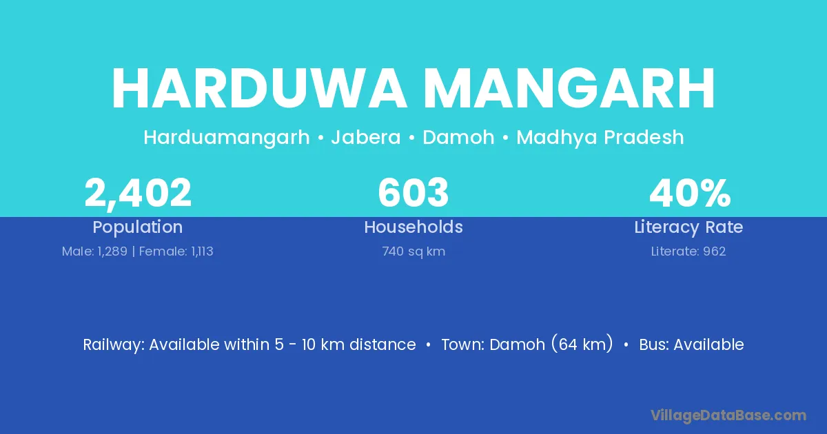 Damoh (64 km) is the nearest town to Harduwa Mangarh village for major economic activities and is located approximately 64 km away.