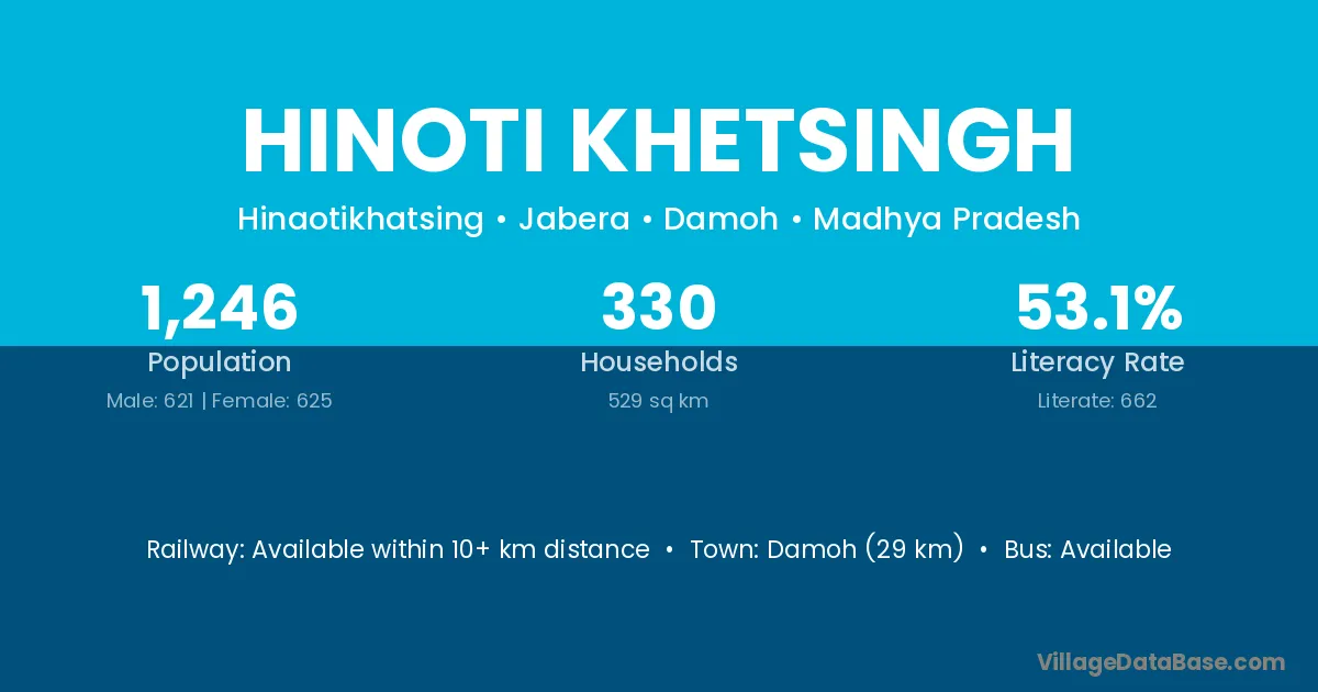 Damoh (29 km) is the nearest town to Hinoti Khetsingh village for major economic activities and is located approximately 29 km away.