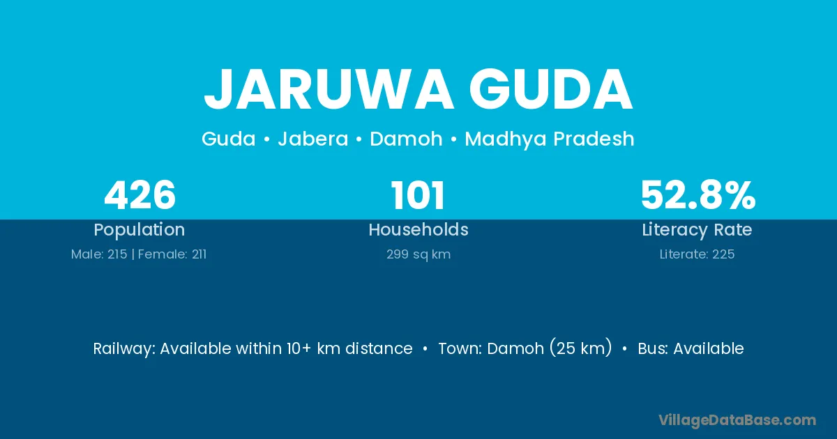 Damoh (25 km) is the nearest town to Jaruwa Guda village for major economic activities and is located approximately 25 km away.