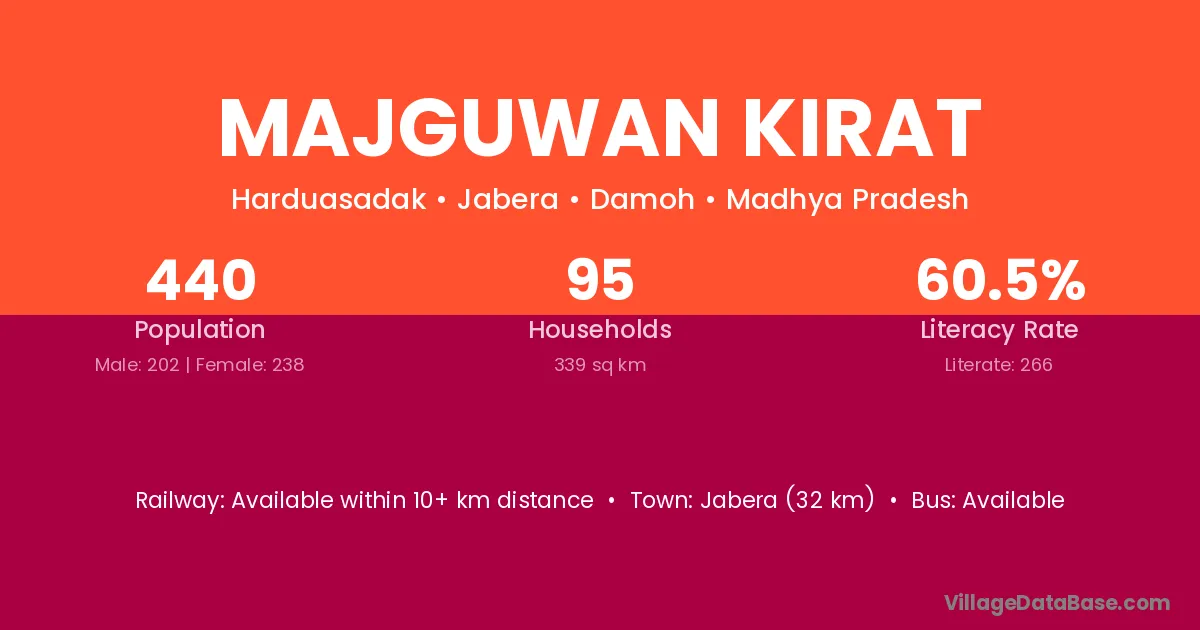 Jabera (32 km) is the nearest town to Majguwan Kirat village for major economic activities and is located approximately 32 km away.