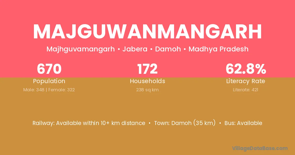 Damoh (35 km) is the nearest town to Majguwanmangarh village for major economic activities and is located approximately 35 km away.