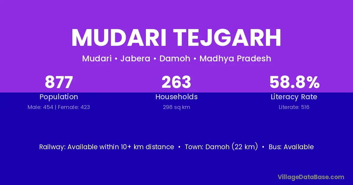 Damoh (22 km) is the nearest town to Mudari Tejgarh village for major economic activities and is located approximately 22 km away.
