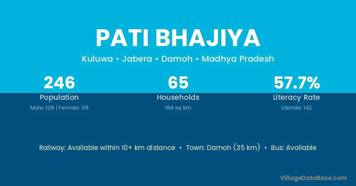Damoh (35 km) is the nearest town to Pati Bhajiya village for major economic activities and is located approximately 35 km away.