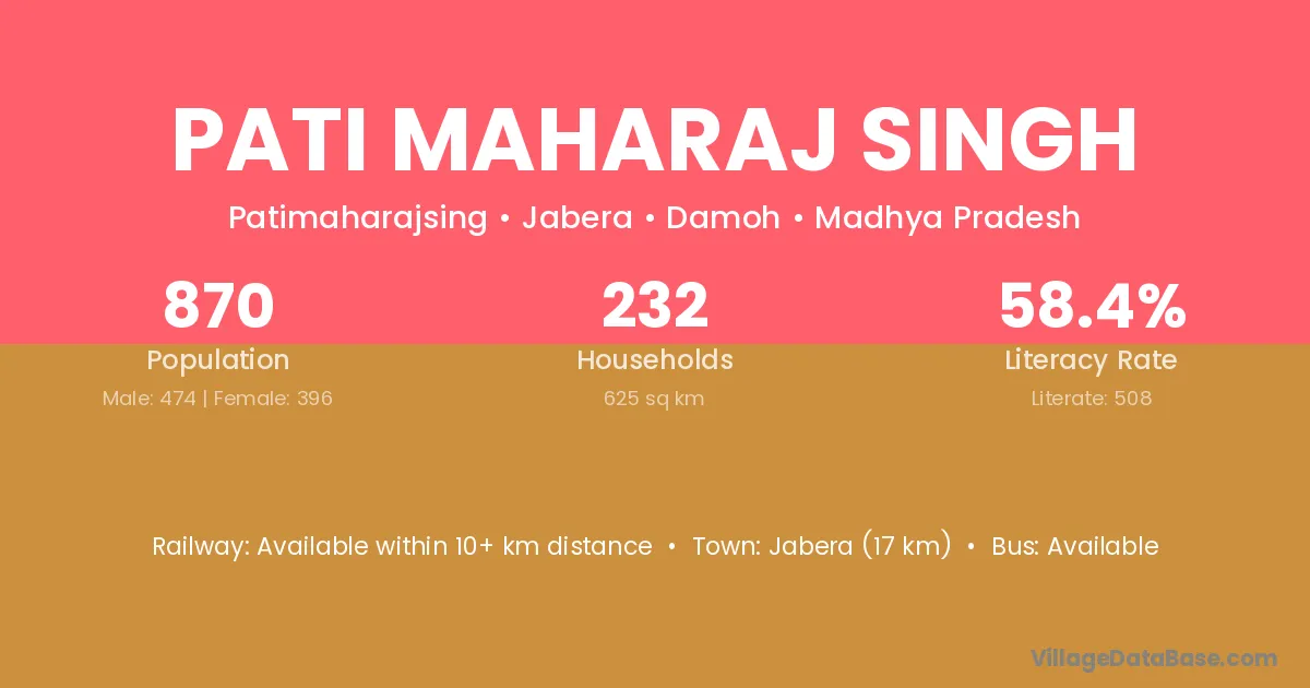 Jabera (17 km) is the nearest town to Pati Maharaj Singh village for major economic activities and is located approximately 17 km away.