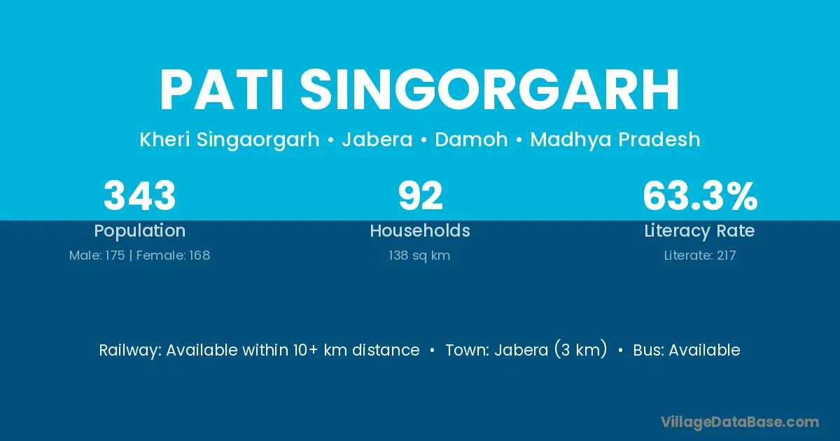 Jabera (3 km) is the nearest town to Pati Singorgarh village for major economic activities and is located approximately 3 km away.