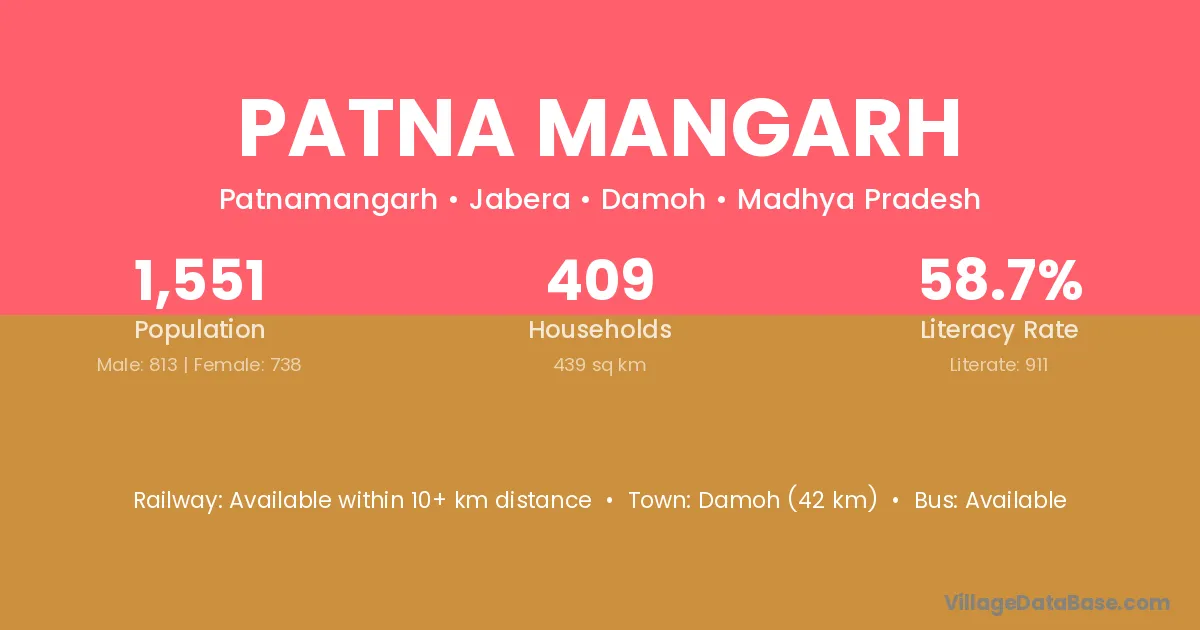 Damoh (42 km) is the nearest town to Patna Mangarh village for major economic activities and is located approximately 42 km away.