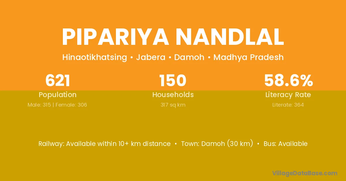 Pipariya Nandlal village has a total population of 621 people, of which 315 are males and 306 are females.