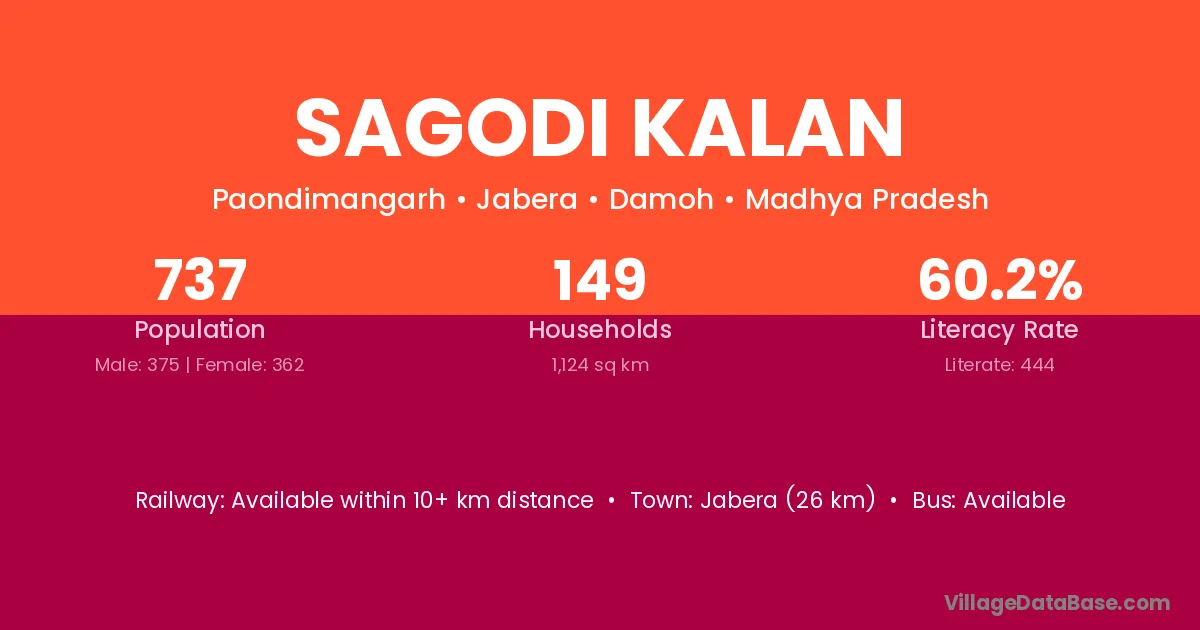 Jabera (26 km) is the nearest town to Sagodi Kalan village for major economic activities and is located approximately 26 km away.