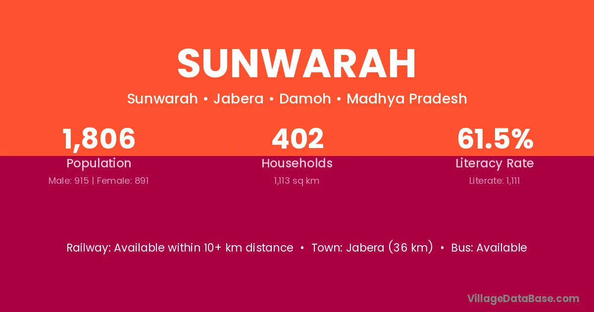 Jabera (36 km) is the nearest town to Sunwarah village for major economic activities and is located approximately 36 km away.