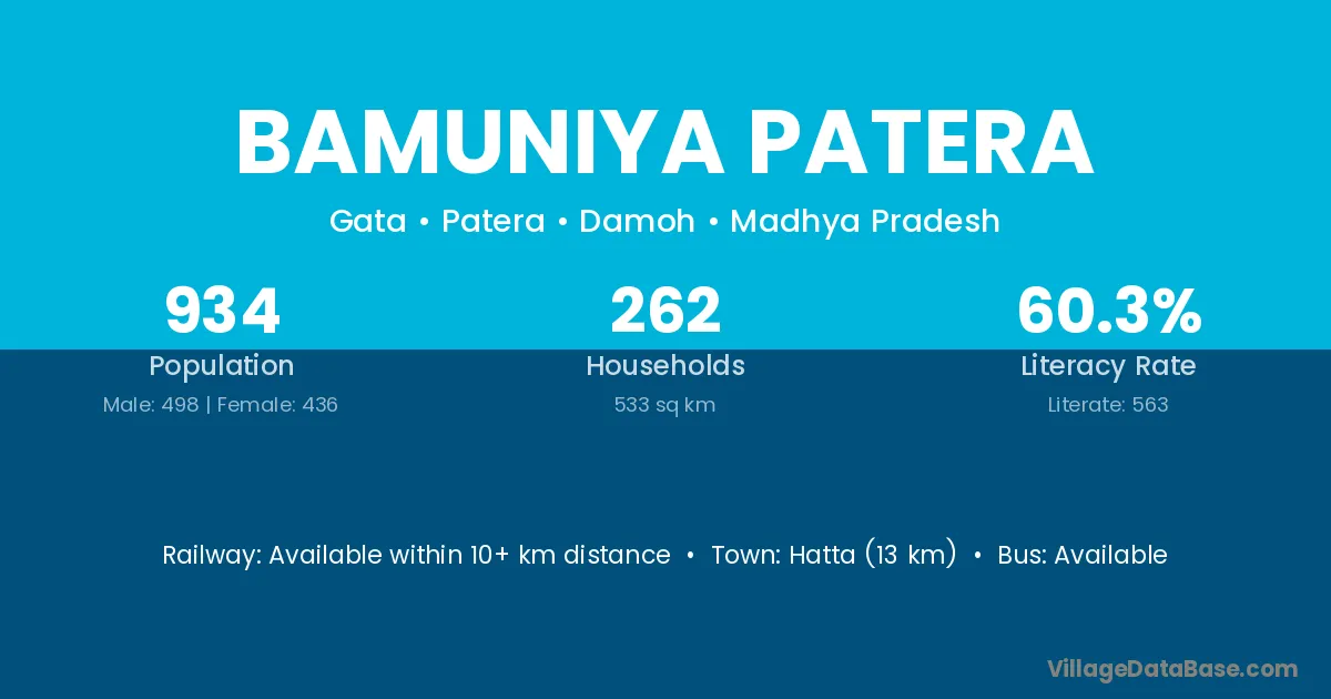 Hatta (13 km) is the nearest town to Bamuniya Patera village for major economic activities and is located approximately 13 km away.